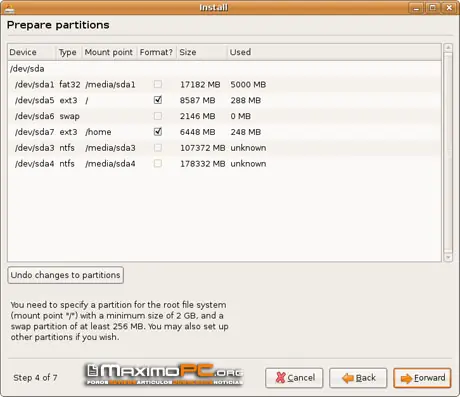 * Que exista al menos una partición dedicada al Swap (se formatea como partición Swap).