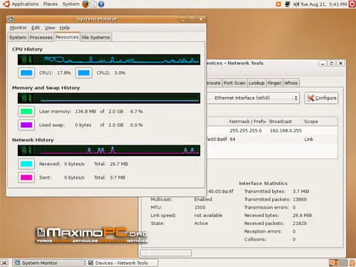 Aquí vemos 2 aplicaciones que son muy usadas, por un lado vemos el panel de control de Red que podemos acceder simplemente haciendo doble click en el icono de red en la parte superior derecha, luego el System Monitor que es lo mas parecido al TaskMan del Windows, observen el consumo de recursos una vez finalizada la instalación y con los drivers de NVIDIA activados, 136Mb de memoria usados de un total de 2Gb, esto muestra una diferencia de 136 contra casi 500Mb en Vista, lo cual implica que en Ubuntu disponemos de aproximadamente 1910Mb de memoria RAM para programas, el Ubuntu es conciente de la memoria para cache de disco, solo que no requiere un Cache extenso para mantener el disco muy lejos de realizar Swap, de hecho, trabajar en Ubuntu hace que rara vez veamos al disco, el manejo de recursos es simplemente sorprendente y va a llamar la atención mucho mas a un usuario de Windows mas que a un usuario de Linux que sabe de estas diferencias, por otra parte, también el manejo de CPU es superior y cada CPU se maneja por separado con total libertad, recuerden que la mayoría de las aplicaciones en Linux son Multithreaded, así que no incurre en los problemas que actualmente el Windows tiene con respecto a optimizaciones.