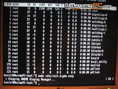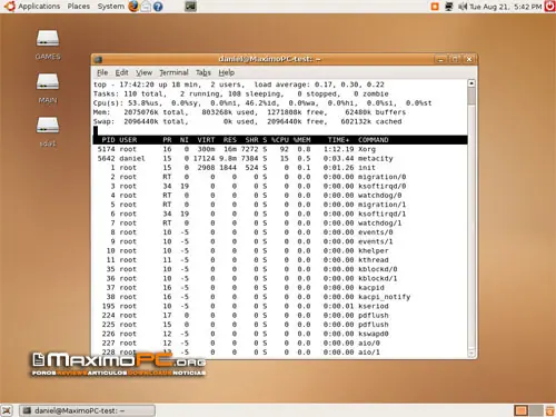 Si somos de aquellos que nos gusta ver internamente al Linux, podremos obtener mucho mas información con la aplicación "top" que puede correr incluso sin escritorio, aquí vemos como la cantidad de memoria usada es de 803268K (casi 800Mb) contrariamente a lo que vemos en Vista, donde incluso con Cache se consumen 500Mb aproximados de RAM, el Ubuntu reporta solo el espacio usado realmente por el Kernel y programas y no el espacio usado por Cache, por lo cual, el manejo de memoria es ligeramente distinto.