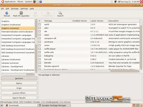 Los repositorios estan ordenados por categorías y no hay que "navegar" para traer archivos, simplemente basta con saber el "nombre" de un programa para poder bajarlo o buscarlo en el Search, el proceso de bajar consta en hacer "Click" sobre el casillero vacio en Synaptic y clickear en "Apply" eso es todo. El programa se baja automaticamente del respositorio, se instala y se crean los accesos directos en el Menu principal.