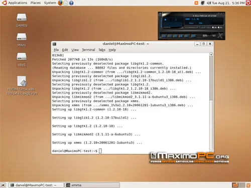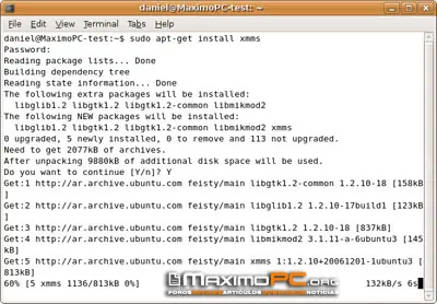 Aquí vemos como una simple sentencia permite instalar el XMMS, si vamos al menu Audio/Video vemos el XMMS listo para ejecutar, lo abrimos y aparece en pantalla. Si quisiera instalar un grupo de programas, todos al mismo tiempo, es mas facil aún, solo debo agregar los nombres de ellos todos seguidos, ej: "sudo apt-get install xmms xmms-skins firefox vlc mplayer"