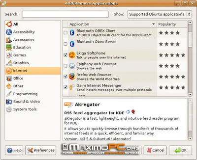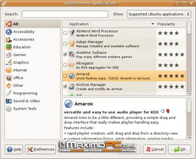 En caso de ser un fanatico de Windows y no poder lidiar con todo este asunto de los comandos o Synaptic, podremos recurrir a un programa mucho mas sencillo: Add/Remove Applications. Este programa, por supuesto, usa internamente apt-get, pero la forma en que lo representa es mucho mas agradable, todos los programas separados en categorías y con iconos y puntuación por popularidad de bajada, esto es incluso mas simple que en Windows y tenemos toda una biblioteca en internet a nuestra disposición lista para ser descargada.