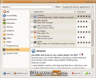 Aquí la de sonido y Video, aquí nos disponemos a instalar Amarok que a pesar de ser un programa de Sonido para KDE (otro entorno gráfico) aún asi puede usarse en Gnome, ya que el Ubuntu se encargará de instalar las librerias y dependencias correspondientes por nosotros, tanto el sistema gráfico KDE como Gnome son intercambiables, de hecho, podría tener ambos sistemas en la misma maquina, en serio lo digo? en serio, para cambiar todo el entorno gráfico del Ubuntu y convertirlo en un Ubuntu con KDE (similar a Kubuntu) solo debemos tipear en la linea de comandos "sudo apt-get install kde" o buscarlo a traves de Synaptic, cada tipo de entorno gráfico quedará a nuestra disposición en el menu de Login y podremos elegir con cual entorno gráfico ingresar antes de poner nuestra clave, claro está que como dije antes, los programas de un entorno y otro son intercambiables, así que no necesito realmente a todo el sistema KDE para correr Amarok, por cierto, Amarok es uno de los mejores programas de Audio/Playlist/Radio de Linux.
