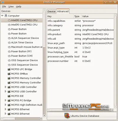 Aquí vemos el Device Manager del Ubuntu, similar al de Windows, solo que con distinta información sobre cada dispositivo, podemos ver como el nForce 680i SLI se identifica con su codename en MCP55.