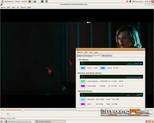 Aquí vemos el uso de CPU, extremadamente bajo !, observen que se usan tan solo 30% de un solo procesador, hay que tener en cuenta que los valores no son comparables con el Windows Vista o Windows XP por una sencilla razon, el TaskManager de XP/Vista utiliza un valor de CPU combinado para indicar el uso de CPU, así, un 50% equivaldría a uno de los procesadores corriendo al máximo, en Ubuntu no tenemos valor combinado, cada procesador tiene su propio porcentaje. Si tendría que combinar los valores, el 30% de un solo procesador equivaldría a no mas de 15% en Windows, pero esto es tan solo una aproximación.
