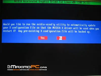 Una vez terminado, el Driver pregunta si queremos modificar la configuración de pantalla para reflejar el driver, las configuraciones de pantalla se escriben en un archivo llamado "xorg.conf", en caso de que querramos hacerlo manualmente también podemos, pero podemos dejar al driver que lo haga automaticamente.