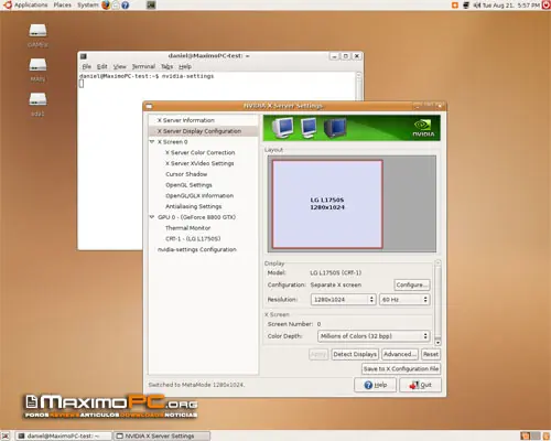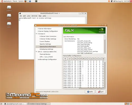 Este es el panel de control de NVIDIA en Linux y se accede simplemente creando un acceso directo a la aplicación "nvidia-settings" o bien escribiendo "nvidia-settings" en cualquier consola del sistema, todo este proceso de actualización de Driver se hizo sin ninguna necesidad de reiniciar el sistema.