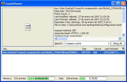 5. Accedemos al menú Herramientas / Cacheviewer de nuestro Firefox. En la zona donde dice Search: escribimos cache myspace (palabras clave del mensaje del paso anterior). La lista de ficheros se reducirá a uno sólo. ¡Ahí tenemos nuestro mp3! Ahora sólo basta obtenerlo, que es tan fácil como hacer doble clic en el fichero y guardarlo, renombrandolo a nuestro gusto. Si tienes problemas con este último paso de encontrar el MP3 del caché, intentalo con las siguientes instrucciones: