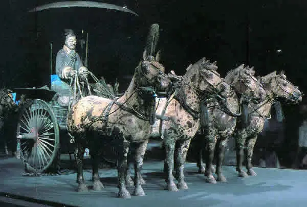 También hay un grupo de caballos que formaban parte de un conjunto de carros. Fueron encontrados con arreos y accesorios de latón y han podido ser identificados como de la raza Gnasu y Xinjiang. Todos fueron representados con dientes para dar muestra de que se trata de animales jóvenes.
