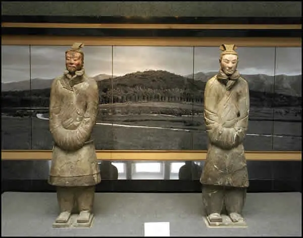 Cuatro de estas figuras especialmente bien conservadas se axhiben aparte: un arquero con la rodilla en el suelo, un jinete con su caballo, un oficial con una cuidadaperilla y la magnífica estatua de un general de 2 m de altura, con una armadura grabada y un birrete con dos colas. También se exhiben algunas de las armas encontradas, incluida una enorme hacha de guerra de bronce.