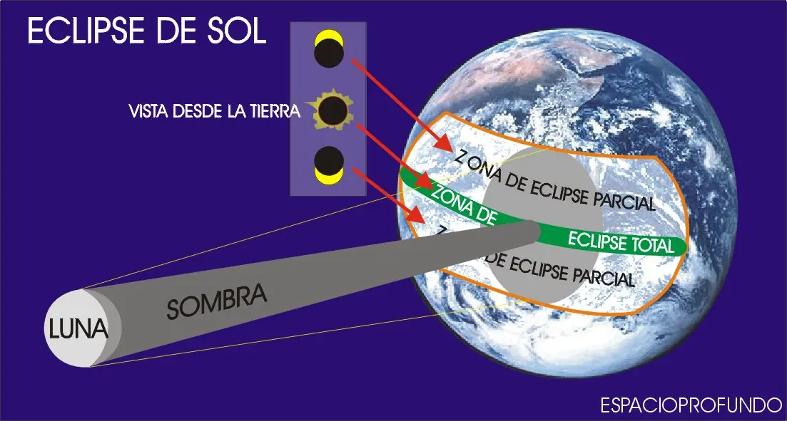 La sombra de la Luna está dividida en la umbra y la penumbra. Si uno observa el eclipse desde la umbra, el eclipse que se ve es TOTAL. Si se observa desde la penumbra, el eclipse será PARCIAL.