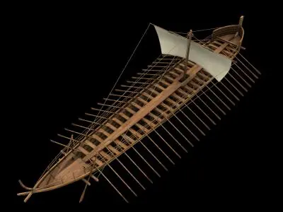El trirreme era la embarcación más avanzada de la época, medía 40 m de eslora y unos 7 de manga, estaba construida de madera y poseía un gran espolón en su proa recubierto de bronce. Los trirremes estaban provistos de velamen, pero en combate únicamente se utilizaba la fuerza de los remeros que se situaban en tres filas (de ahí su nombre), sumando un total de 170 bogadores. La tripulación se completaba con una decena de infantes de marina, entre 4 y 6 arqueros, el capitán, el contramaestre, el jefe de boga, el timonel, el carpintero y los oficiales; en total unos 200 hombres. El timonel, llamado piloto, era el tripulante más importante del barco; de su pericia dependía el éxito o el fracaso en el combate, ya que su misión era dirigir la embarcación a toda velocidad contra el flanco o la popa del barco enemigo para, con el espolón, abrir un boquete en su casco. Acto seguido debía maniobrar para evitar quedar enganchado en la nave rival. El trirreme era una nave veloz, alcanzaba los 10 nudos a plena boga, esto unido a la pericia de los pilotos para cargar contra embarcaciones enemigas, hacían de ella un arma temible. Los trirremes fenicios eran poco más largos que los griegos, aunque más ligeros y maniobrables, y su tripulación total era de 230 hombres entre remeros, oficiales , infantería de marina y arqueros, siendo la dotación de infantes y arqueros de unos 40.