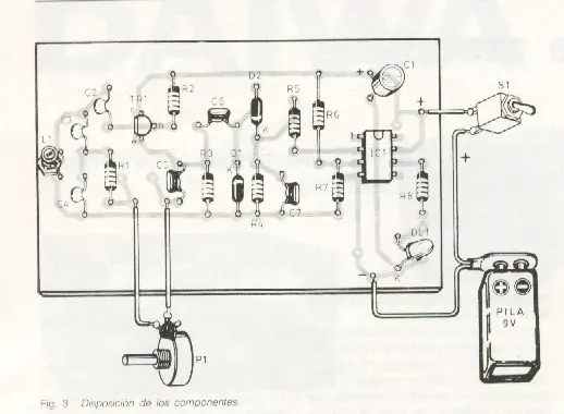El detector de metales ha sido diseñado para su construcción en una placa de matriz de taladros. Los detalles referentes a la disposición de los componentes y a las pistas de la placa como se puede apreciar en la figura.