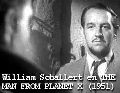 Pero no sigamos avanzando. La posada en la que García y Vasca se dan la gran comilona es atendida por William Schallert, un actor de reparto omnipresente en películas y episodios de series entre fines de los '40 hasta los '90. Y el motivo para citarlo es que se vio muy relacionado con un viaje espacial, pero, al igual que Cabot, no con uno propio, sino con el de un tercero, en este caso, un extraterrestre. Nos referimos a THE MAN FROM PLANET X (El Hombre del Planeta X-1951), esa interesante película del director de culto Edgar G. Ulmer. En tal ocasión, Schallert encarnó a un científico con oscuros planes para con el ser alienígena proveniente de algún confín espacial.