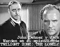 Ahora pasamos al décimo tercer episodio de la serie, THE FALL OF MONASTARIO (El Final de Monasterio-1958). En ese episodio Monasterio (o Monastario, si ud. es purista) razona que siempre que aparece El Zorro, desaparece Don Diego y viceversa. Mientras Monastario en su propio despacho manifiesta sus sospechas al propio Don Diego, llegan novedades: el Virrey va a llegar en breve a Los Angeles. Mientras percibimos las preocupaciones de Monastario en demostrarle al Virrey que Don Diego es el temible Zorro, los aficionados al cine y las series de los '50 no podemos dejar de percibir que el Virrey es encarnado por John Dehner. Y automáticamente nos viene a la cabeza un episodio de THE TWILIGHT ZONE (La Dimensión Desconocida), titulado THE LONELY (El Solitario-1959). Jack Warden es un convicto de asesinato condenado a 40 años de reclusión en un remoto asteroide. Cada tanto llega al planetoide una nave tripulada por tres astronautas para traerle aprovisionamientos. El oficial al mando de esta nave no es otro que el citado John Dehner.