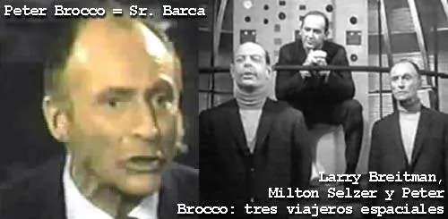 Adelantémonos al episodio número 18, ZORRO FIGHTS HIS FATHER (1958). Ante las protestas de los campesinos, el nuevo villano de turno, el Magistrado Galindo (Vinton Haworth), anuncia que Los Angeles corre peligro de quedar en la anarquía. Algo debe hacerse. Don Alejandro se reúne con el Señor Barca, y ambos convocan a los caballeros de la ciudad, para crear el "Comité de Vigilancia", cuyo primer acto es arrestar a Paco (Noel De Souza), líder de los campesinos. Veamos al Sr. Barca. Ese hombre de mediana edad, calvo y de aspecto esquelético nos resulta familiar. El actor que lo encarna es Peter Brocco... sí, el mismo que hizo de viajero espacial en otro episodio de La Dimensión Desconocida. Se trata de HOCUS POCUS AND FRISBY (Abracadabra Frisby-1963). En esa oportunidad un grupo de tres extraterrestres con aspecto de "hombres de negro", al mando de Milton Selzer, llegan a una localidad rural norteamericana e intentan secuestrar a un pueblerino (Andy Devine) que resulta ser el mentiroso más grande de todo el condado. Uno de los visitantes era el nombrado Peter Brocco.