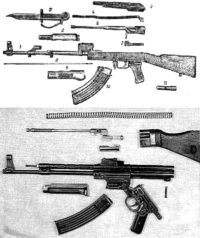 Otras características Selector independiente con pasador transversal para seleccionar fuego a ráfaga o tiro a tiro; seguro de aleta situada atrasada encima del disparador; la mayor parte del arma fabricada con chapa estampada; ventana de extracción cerrada con tapa protectora de apertura automática al montar el arma.