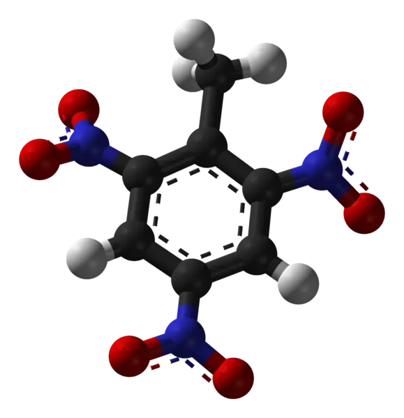 El trinitrotolueno (TNT) o 2,4,6-trinitrometilbenceno (notación IUPAC) es un hidrocarburo aromático cristalino de color amarillo pálido que se funde a 81 °C. Es un compuesto químico explosivo y parte de varias mezclas explosivas, por ejemplo el amatol que se obtiene mezclando TNT con nitrato de amonio. Se prepara por la nitración de tolueno (C6H5CH3), tiene fórmula química C6H2(NO2)3CH3.