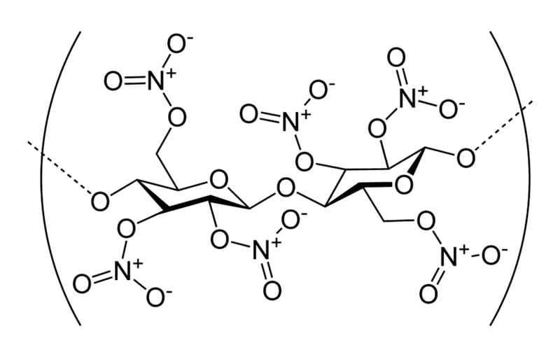 El nitrato de celulosa, nitrocelulosa o algodón pólvora fue sintetizado por primera vez en el año 1845 por Schönbein. Es un sólido parecido al algodón, o un líquido gelatinoso ligeramente amarillo o incoloro con olor a éter. Se emplea en la elaboración de explosivos, propulsores para cohetes, celuloide (base transparente para las emulsiones de las películas fotográficas) y como materia prima en la elaboración de pinturas, lacas, barnices, tintas, selladores y otros productos similares.