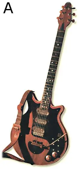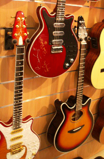 Brian toca muchas guitarras diferentes, pero su preferida es una hecha a medida para él por el renombrado constructor John Birch, de Birmingham. Es una réplica exacta de la que construyó Brian cuando era joven.