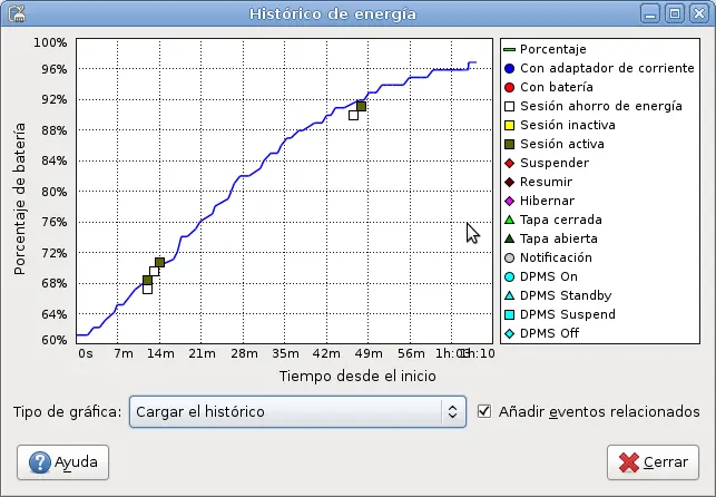 Presiona Alt+F2 y en la ventana de ejecución de comandos escribe gnome-power-statistics y haz clic en Ejecutar. Verás una gráfica del uso exacto de energía de tu computador desde el último booteo (si tu hardware proporciona esta característica).