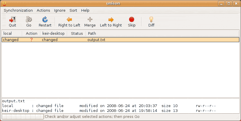 9. Después de un par de minutos, una ventana de Unison en el PC de sobremesa indicará la diferencia de archivos entre los dos directorios. El encabezado Path mostrará el archivo en cuestión, y bajo el encabezado Action se indicará la dirección de viaje por medio de una flecha—si la flecha apunta a la izquierda, el archivo será transferido al PC de sobremesa desde la laptop. Si apunta a la derecha, el archivo será transferido desde el PC de sobremesa hacia la laptop. Si no deseas sincronizar un archivo en particular, selecciónalo, y haz clic en el botón Skip en la barra de herramientas. Sin embargo, asumiendo que ya estás satisfecho con todo, haz clic en el botón Go en la barra de herramientas. Los archivos serán entonces copiados. Cuando Unison haya terminado (mira en la barra de estado en la parte inferior izquierda de la ventana y en el encabezado Status de la lista de archivos), puedes cerrar la ventana del programa.