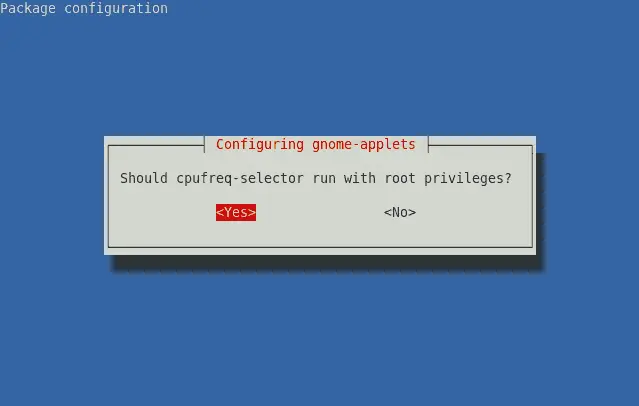 Verás un aviso informándote que habilitar el programa cpufreq-selector podría tener algunos riesgos de seguridad. Esto es cierto, pero, como siempre, la usabilidad debe estar balanceado con la seguridad, además somos temerarios y no tenemos miedo de nada. Presiona Enter; entonces, en la siguiente pantalla, selecciona Yes, y presiona Enter de nuevo.