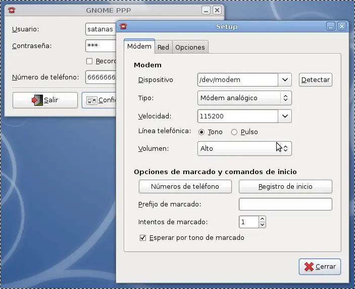 Si tu módem funciona, puedes usar la aplicación gnome-ppp para conectarte/desconectarte. Puede ser instalado vía Synaptic y, una vez instalado, lo encontrarás en el menú Aplicaciones —> Internet. Cuando lo corres por primera vez, haz clic en el botón Configuración, y luego haz clic en el botón Detectar en el cuadro de diálogo que aparece. Una vez hecho, haz clic en Cerrar para volver a la ventana principal, donde puedes poner el nombre de teléfono, usuario y contraseña de tu ISP. Entonces haz clic en Conectar para iniciar la marcación.