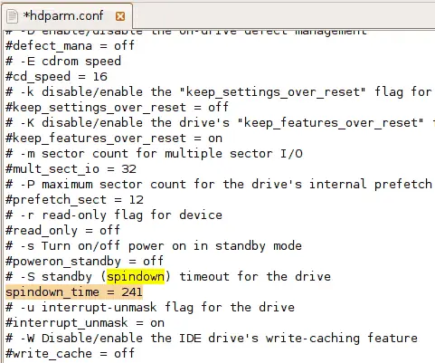 Modifica el valor de spindown_time al valor que desees. Cada número son cinco segundos, así que el valor por defecto que son 24 equivale a 120 segundos (24 x 5 = 120 segundos). Sin embargo, para los valores mayores que 240 la cosa cambia—arriba de 240, cada unidad equivale a 30. Así que, un valor de 241 equivaldría a 30 minutos, un valor de 242 equivaldría a 60 minutos, y así. Poner la línea así: spindown_time = 241 es una buena idea, ya que el disco se desactivará al cabo de 30 minutos de inactividad.