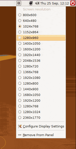 Entonces un nuevo icono aparecerá al lado del NetworkMonitor en el área de notificaciones (system tray). Haciendo clic sobre él, se listarán todas las posibles resoluciones que puedes escoger.