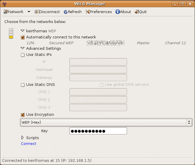 5. Antes que puedas conectarte, que se hace con el botón Conectar, despliega la configuración de conexión haciendo clic en el costado de la red en la lista. Entonces despliega Configuraciones Avanzadas, y haz clic en la opción Usar cifrado. Selecciona el tipo de protección wifi, y digita la contraseña. Por supuesto, si la red no tiene protección (usualmente descrita como open network), puedes saltar este paso. Luego haz clic en Conectar. Una vez que te has conectado a la red, puedes cerrar el programa de configuración de Wicd.