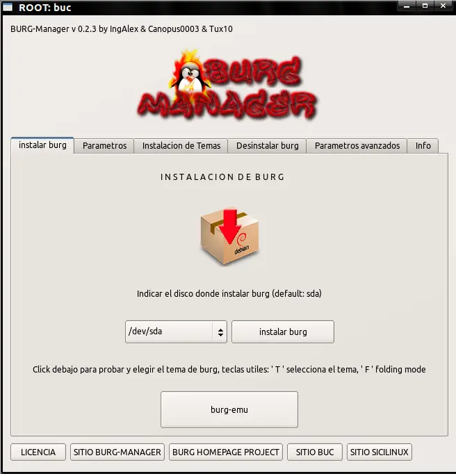 Cuando tengamos los paquetes .deb instalados, ejecutamos burg-manager y en la interfaz pulsamos el botón de instalar BURG. Una vez hayamos hecho esto, podremos cambiar parámetros como el tiempo de espera o el sistema predeterminado. Si queremos, también podemos probar nuestra nueva configuración pulsando el botón Burg-Emu.