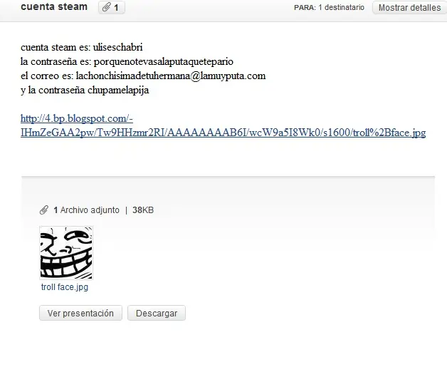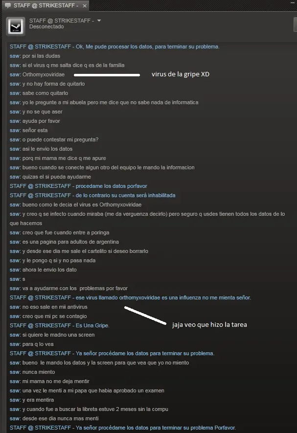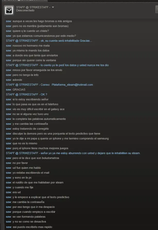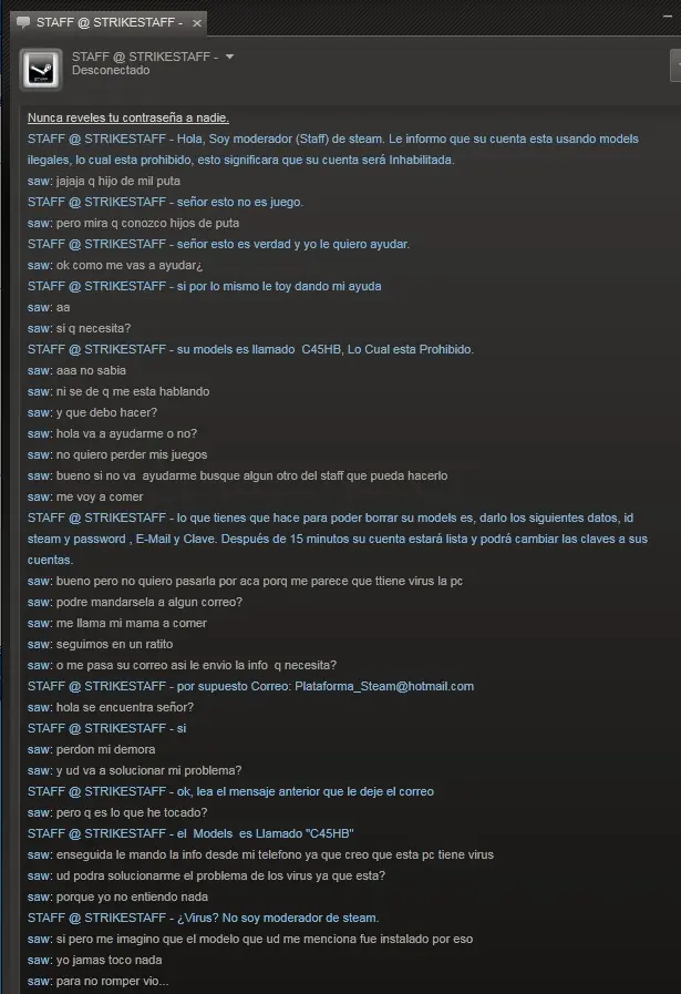 bueno como siempre hay algún boludo que pretende que le pasemos nuestra contraseña o correo dicendo que es del staff de steam y que nos van a bloquear el usuario etc. y bueno a lo ultimo se empezó a impacientar (recien sacado del horno)