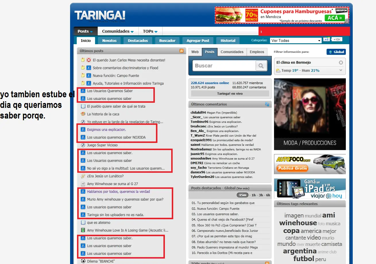 A@Anónimo7/23/2011+0-5Siiii mejor hagan algo util....Descarguen mi CD Graciashttp://www.taringa.net/posts/musica/11780633/Moral-Abajo_-Grabamos-un-disco_-descargalo-gratis_.htmlA@Anónimo7/23/2011+2-0A@Anónimo7/23/2011+0-0dijo:Q PASO Q TODO EL MUNDO QUIERE SABER?? LLEGUE TARDE Y NO ME ENTERE
