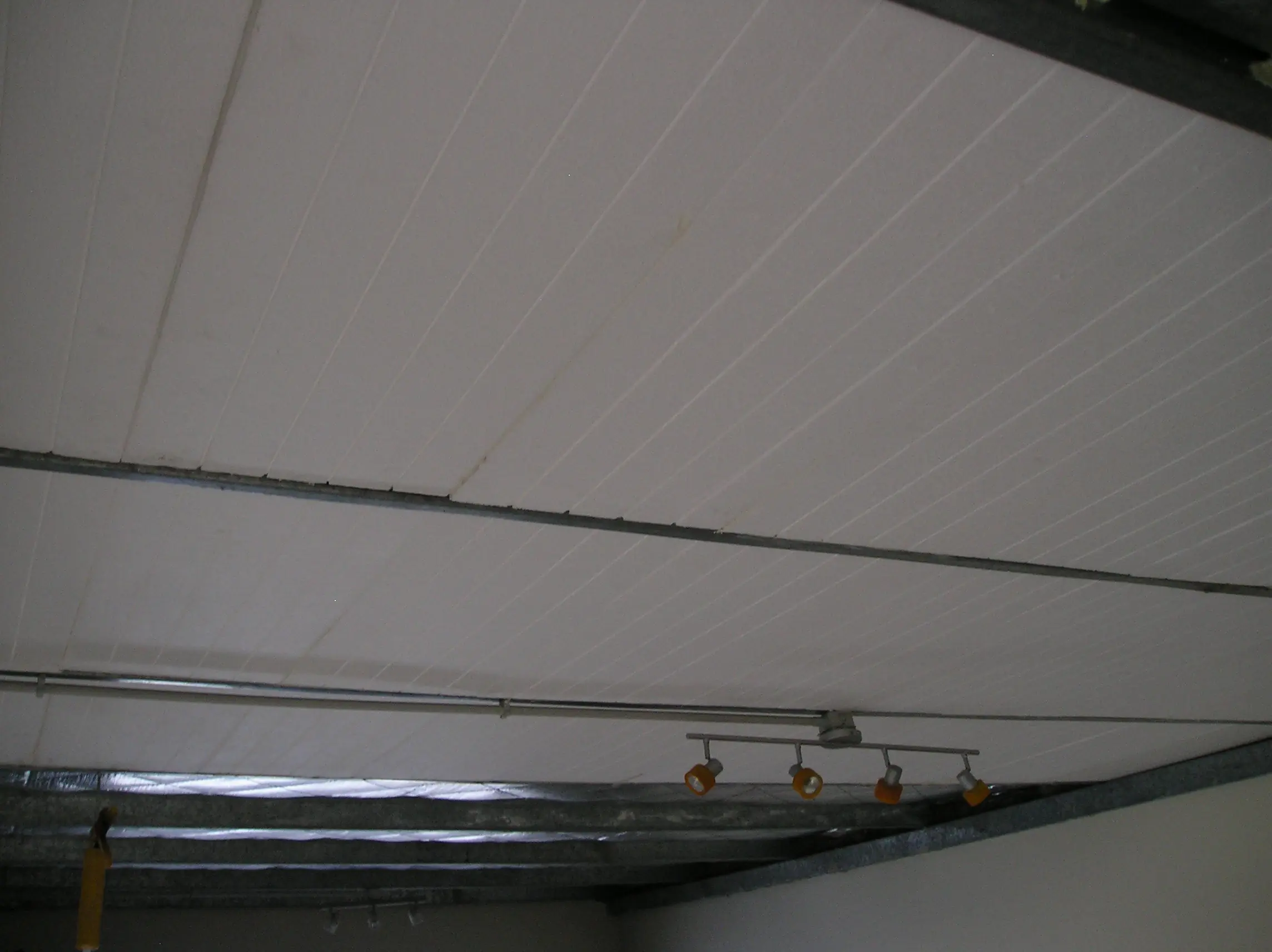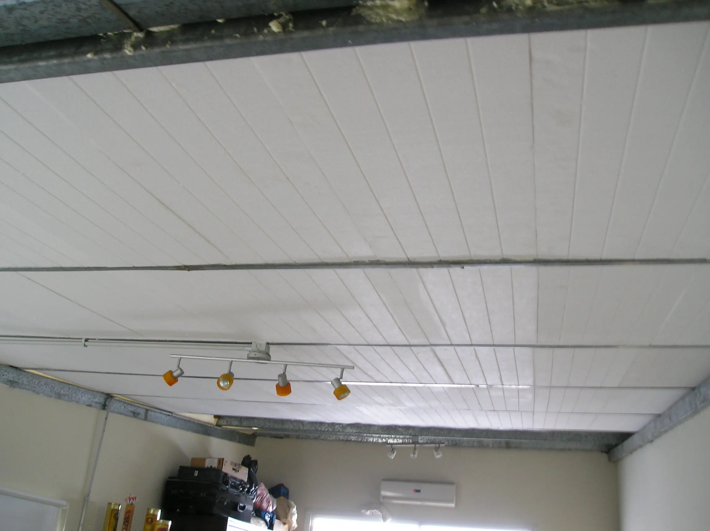 Vivo en un mono ambiente, tengo que aprovechar bien los espacios. por que sino la visual rápidamente se arruina!!! Mi techo es así.... Chapa con Aislante, estéticamente no esta tan mal. Pero en Verano de cocinas y en invierno te congelas, cuando llueve te cagas todo.... La lana de vidrio no alcanza.
