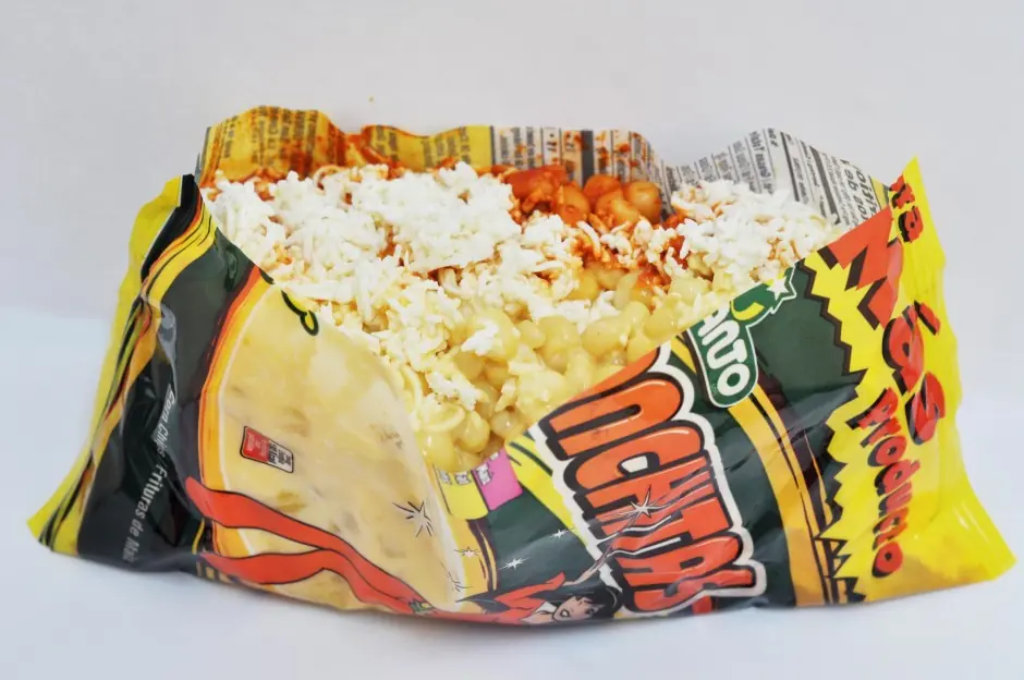 Necesitas una zanahoria, un poco de jicama rayada, pepino al gusto en cuadritos, media bolsa de cacahuates japoneses, limón al gusto, salsa picante, sal, chamoy líquido y miguelito en polvo. Agrega todos los ingredientes a tus Doritos. Revuelve y disfruta.