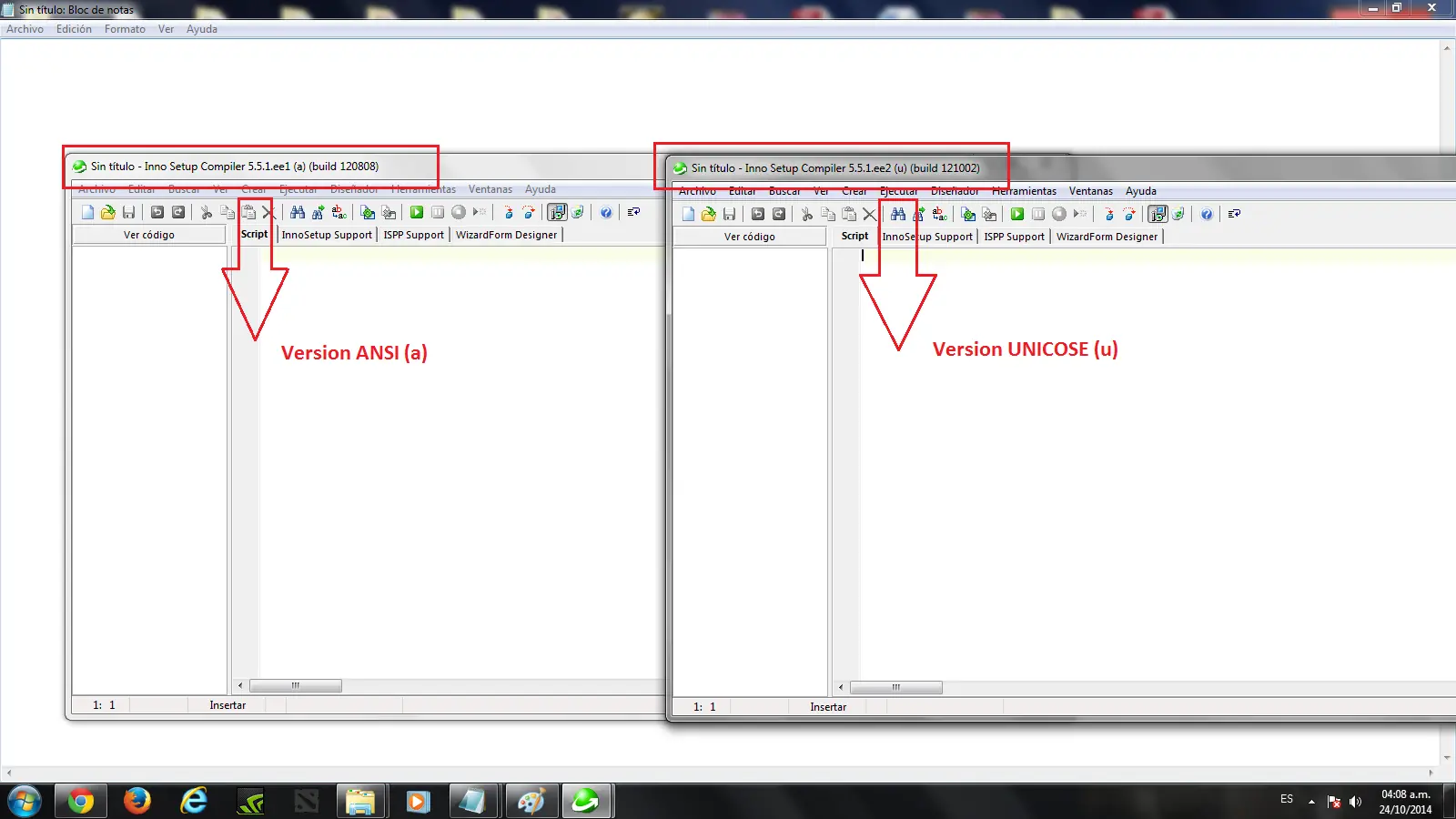 1.2.- para reconocer la versión de unicode que tienes simplemente al abrir tu script en la parte superior cerca del logo encontraras lo siguiente: "Inno Setup Compiler 5.5.1.ee2 (a) donde (a) es la versión ANSI y (u) es la versión UNICODE