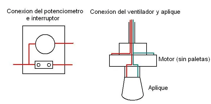 -Si tiene un aplique (en realidad no importa el numero de apliques) necesitamos pasar tres cables, el vivo que viene desde el potenciometro para el ventilador, el vivo que viene desde el interruptor para la luz y el neutro (ambas cosas, el ventilador y el aplique, se conectan al mismo neutro). La conexión es similar, pero a esto se debe agregar la conexión de los dos cables del aplique. La conexión del interruptor del aplique es igual a la de cualquier interruptor normal (funciona independientemente del ventilador) y viene dentro del mismo potenciometro, tiene bornes que son para el interruptor y bornes para el ventilador, obviamente no puedo decirte cual es cada uno porque, repito, depende del modelo y marca del ventilador, pero quedate tranquilo porque los vas a poder reconocer ya que están muy bien señalizados.