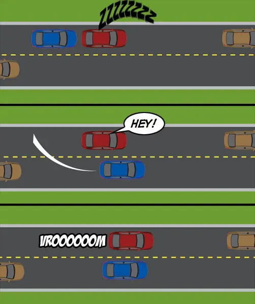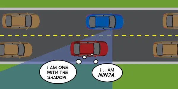 Normalmente, esto es un problema que no representa riesgo, es decir, pocas ocasiones alguien estará en ese punto y cuando lo esté es porque va más lento que tu (y lo terminaras rebasando) o porque va mas rápido y el te rebasara a ti, sin embargo existen aquellos que por alguna razón, quieren forzosamente mantenerse en ese punto, es decir, ellos calculan la velocidad, calculan el ángulo, y por último se toman la molestia de ir imitando tus movimientos para acelerar y frenar cada que tu lo hagas para mantenerse en ese punto... para qué?, nadie lo sabe, lo más seguro es que les gusta parecerse a Naruto o alguno de esos...