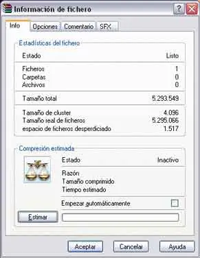 Como podemos observar, en esta ventana que se nos abre, entre otras opciones está la de "estimar", y con ella podremos analizar cómo quedará el archivo comprimido y la extensión y compresión que tendrá. Esto en archivos pequeños no es muy importante, pero sí en archivos grandes donde se duda sobre si entrará o no en un cd, por ejemplo, y no tenemos que comprimir si luego ocupará más de lo que nuestro cd admite, por ejemplo. Así, una vez estimado nos aparecerán los datos tal y como siguen: