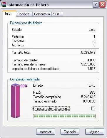 En el ejemplo que hemos puesto, que es el mismo archivo que hemos puesto para el resto de ocasiones, la compresión estimada es relativamente poca, ya que permanece al 98%, pero en otras ocasiones la compresión sí que sería importante. Además, aunque no podamos comprimir mucho los archivos, sí que nos puede interesar utilizar la compresión por el hecho de reunir una serie de archivos (los que sean) en uno solo, comprimido. Eso es lo que ocurre cuando se tiene que colgar algo en internet, que ha de ir reunido en un solo archivo, y la forma más lógica es utilizando un compresor como el winrar
