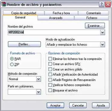 En ella, observaremos que se nos dan diferentes opciones, diferentes pestañas, y quizá la más importante sea la que se nos muestra en "Partir en volúmenes", ya que ahí podremos configurar si lo que queremos es que nos comprima el archivo y nos lo divida para que quepa en un cd (650 o 700 mb) o en un disquete (1,44), etc, y de superar dicho tamaño, lo que hará será crearnos diferentes archivos rar, numerados; o si no picamos en dicha opción, simplemente nos comprimirá el o los archivos seleccionados en un solo archivo rar, tenga el tamaño que tenga.