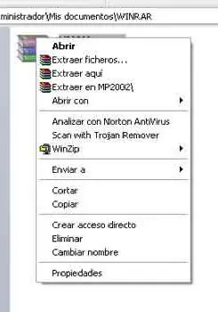 Como podemos observar, las posibilidades para descomprimir se muestran claramente, ya que al lado de ellas vuelve a aparecer el símbolo de winrar , con lo que nos hemos de centrar en ellas para descomprimir. Analicemos de nuevo cada una de las opciones: