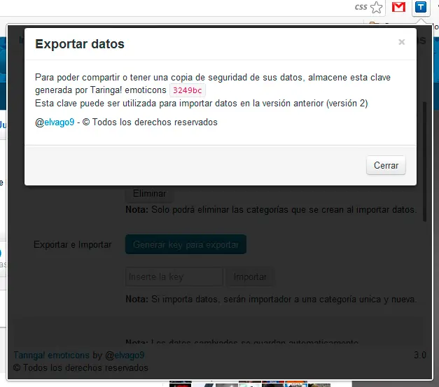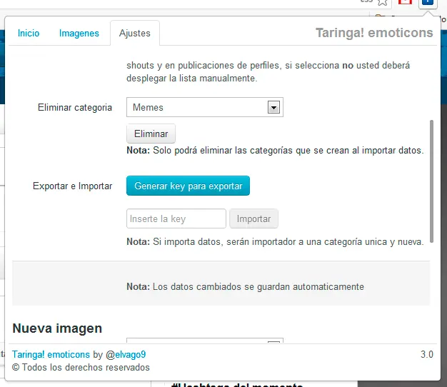 Al igual que la versión anterior existe la posibilidad de compartir sus imagenes por medio de un código que es generado por el sistema, por mas información dirigase a la pestaña (Ajustes) de la extensión. Se puede exportar sus imagenes desde la versión anterior a esta nueva versión, también puede realizar el proceso contrario exportar sus imagenes de esa versión a la antigua versión pero seguramente se pierdan varios datos.