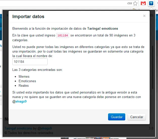 Todas los datos de las importaciones realizadas a esta versión apareceran en una sola categoría que se creara al momento de importar los datos, la categoría llevera el nombre escogido en el preciso momento. Esa categoría creada por separado puede ser eliminada, lo contrario a las categorias que vienen por defecto las cuales son Memes, Emoticones y Reales.