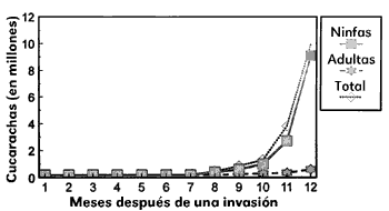 ¡Una cucaracha alemana hembra puede producir hasta ocho cápsulas y con más de 300 crías en total! Si la mitad de las ninfas son hembras y cada una de ellas produce 300 ninfas, y la mitad de esas ninfas son hembras, y cada una produce 300 ninfas... ¡Pienso que ya usted comienza a darse una idea! ¡Teóricamente es posible el que una cucaracha alemana hembra produzca más de 100,000 cucarachas en un año! (Figura 3-3)