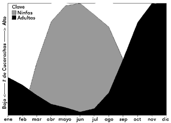 Dentro de dos días después de que la cápsula se produce, se coloca en un área aislada que contenga comida abundante. Aproximadamente dos meses después, las ninfas salen y son más activas desde la primavera hasta el pleno verano. A principios de la primavera, se encuentran sólo las cucarachas orientales adultas; pero al final de la primavera las ninfas son abundantes, y las adultas comienzan a morirse. Para el otoño, la mayoría de las cucarachas individuales son adultas (Figura 3-7).