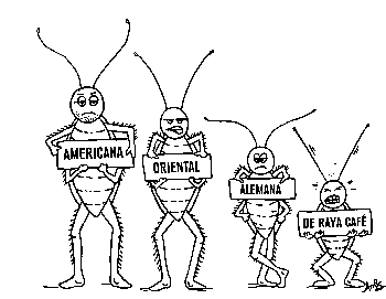 Hay más de 3,500 especies de cucarachas que existen en el mundo. ¡Menos mal, solamente cuatro especies viven en la parte norte de los Estados Unidos! Estas cuatro especies son: la alemana, la de raya café (también conocida como la cucaracha de franja café y cucaracha de banda marrón), la oriental(también conocidas como, bichos de agua), y cucarachas americanas, que viajan por el mundo, viviendo con los humanos casi dondequiera por todo el terrestre.