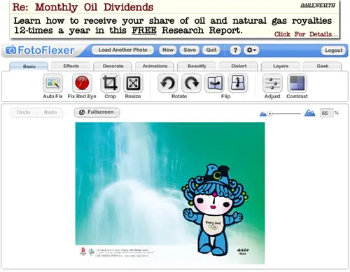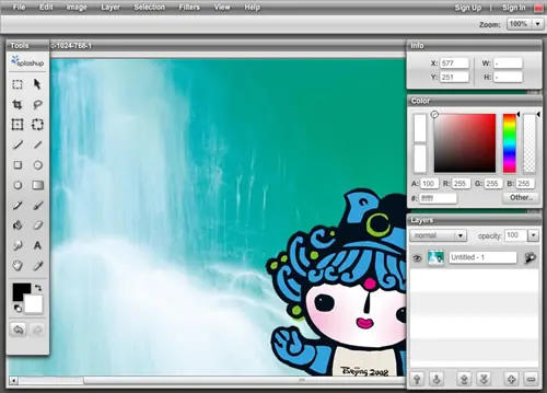 14. Splashup : Excelente editor de imágenes, uno de los más completos de la lista, tiene prácticamente de todo, lo único que no me gusta es que el sitio se abra en una ventana nueva al mejor estilo popup, sacando esto es una de las mejores opciones. Quizás algo que hay que comentar es que el sitio esta basado en flash, pero esto a diferencia de otros lo hace muy lento, quizás para conexiones que no sean rápidas sea una opción terrible por el tiempo que demora en la carga de cosas y en aplicar efectos.