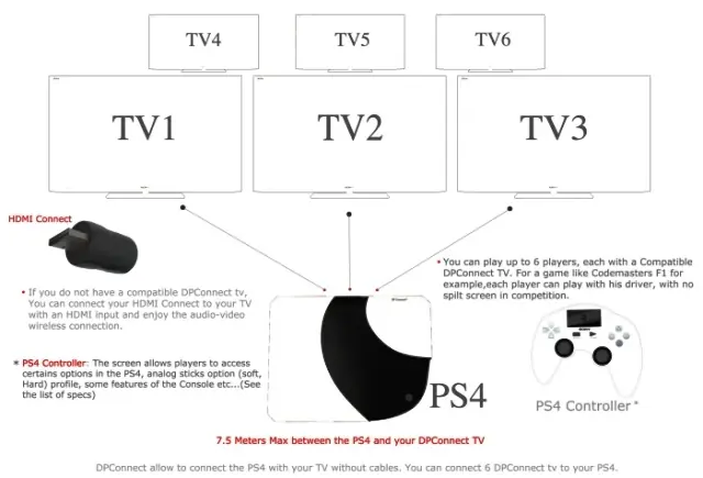 ? DPConnect avanzado permite que dos (o seis) jugadores en dos (o seis) televisores diferentes, conectarse con la misma consola, para que todos puedan ver a su juego sin pantalla dividida. La distancia entre la consola y el televisor debe ser máximo de 7.5m.